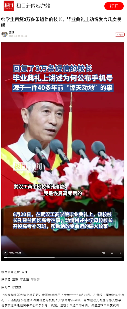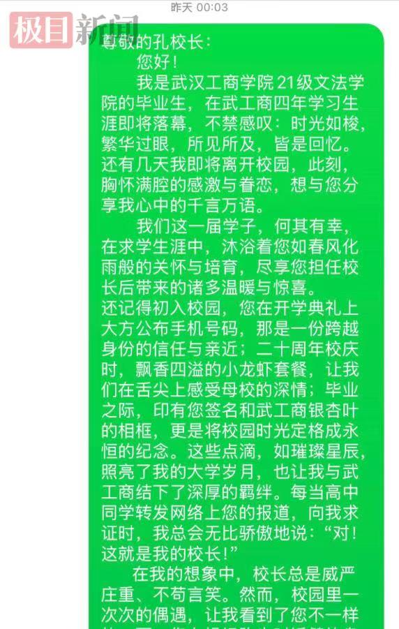 孔建益4年前来武汉工商学院担任校长,在当年的新生开学典礼上,他公布了自己的手机号码,表示愿意倾听学生的心声。如今这批学生即将毕业,他敞开心扉,讲起了一段感动人心的往事。