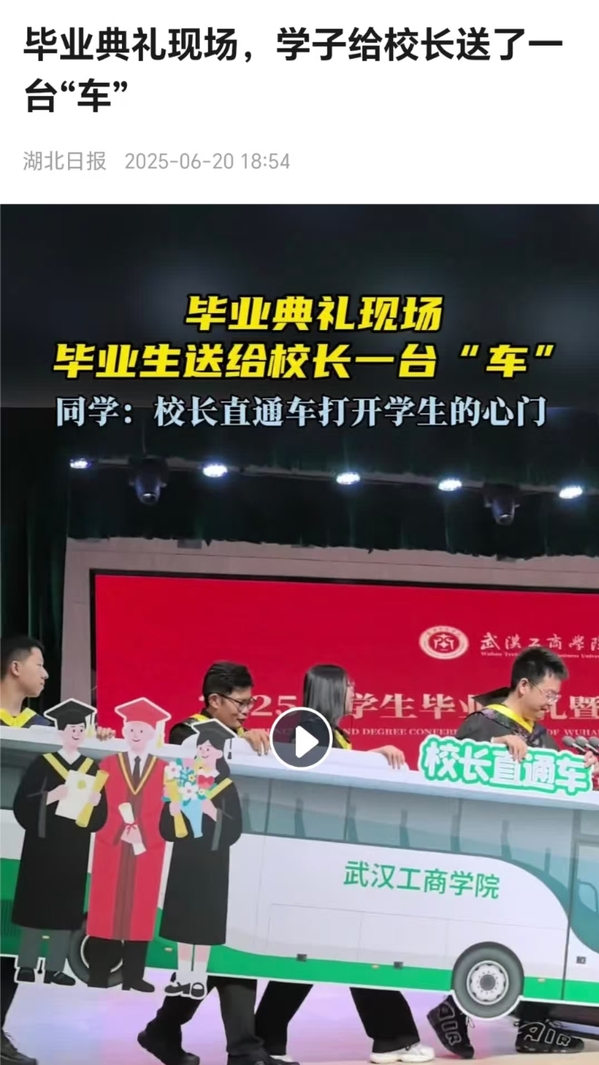 6月20日,在武汉工商学院2025届毕业典礼上,该校计算机与自动化学院几名毕业生将一台“校长直通车”纸板车模型和车钥匙模型送给该校校长孔建益,表达对母校和恩师的诚挚谢意,并比出爱心手势合影。