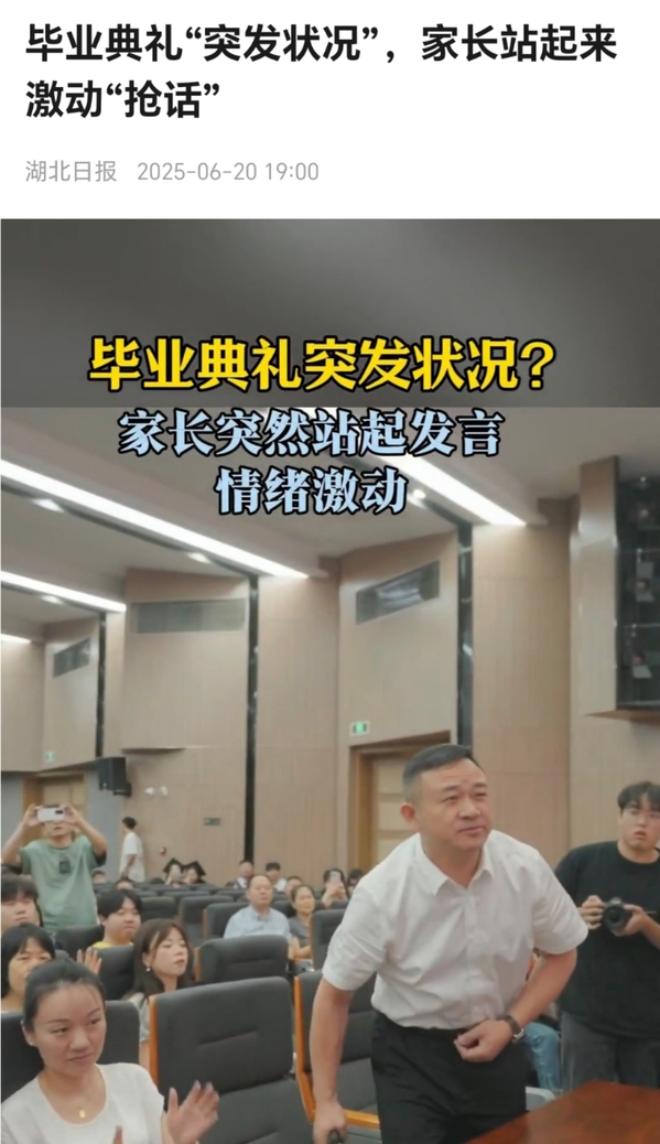 6月20日,武汉工商学院2025届学生毕业典礼现场上演有趣一幕。一位毕业生家长突然从观众席站起来,激动“抢话”,高声向校长孔建益和学校表达谢意:“校长直通车,不仅通往学生,也通往我们家长;我也给校长发了短信,校长也给我回了短信。谢谢校长!”全场师生大笑,报以热烈掌声。