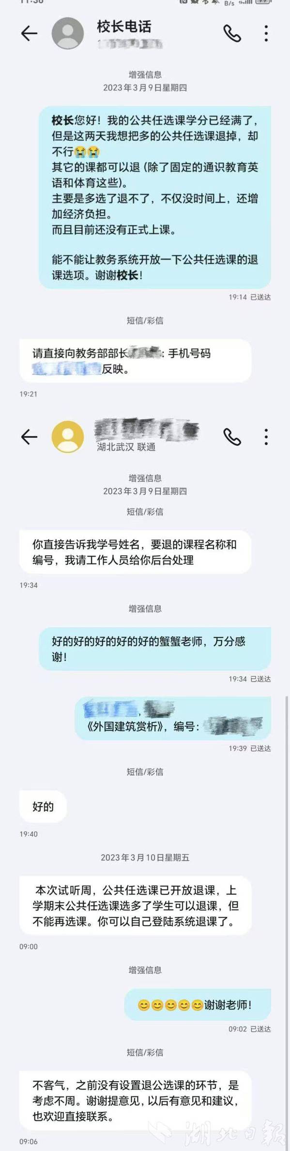 该校文法学院2025届毕业生杨培前年曾给孔建益发短信,反映多选的公共任选课退不了,能不能让教务系统开放相关退课选项。孔建益让教务部迅速联系技术公司更新选课系统,第二天便通知学生可登上系统退课了。杨培向他道谢,他回短信说:“不客气,之前没有设置退公选课的环节,是考虑不周。谢谢提意见,以后有意见和建议也欢迎直接联系。”