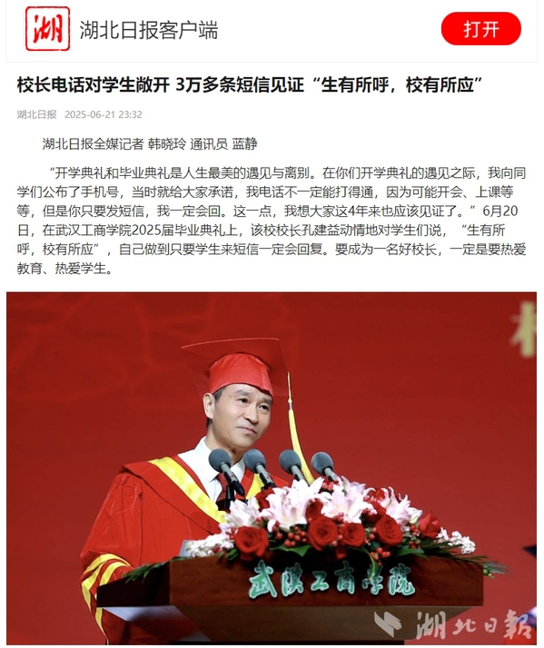 “开学典礼和毕业典礼是人生最美的遇见与离别。在你们开学典礼的遇见之际,我向同学们公布了手机号,当时就给大家承诺,我电话不一定能打得通,因为可能开会、上课等等,但是你只要发短信,我一定会回。这一点,我想大家这4年来也应该见证了。”6月20日,在武汉工商学院2025届毕业典礼上,该校校长孔建益动情地对学生们说,“生有所呼,校有所应”,自己做到只要学生来短信一定会回复。要成为一名好校长,一定是要热爱教育、热爱学生。