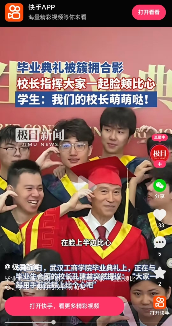 极目新闻快手:毕业典礼被簇拥合影,校长指挥大家一起脸颊比心,学生:我们的校长萌萌哒!