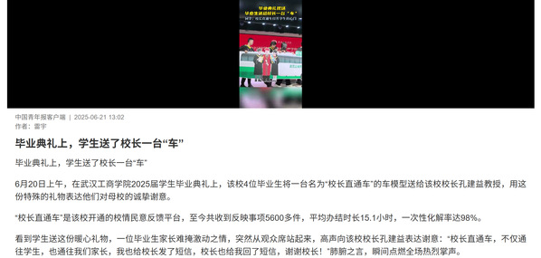 6月20日上午,在武汉工商学院2025届学生毕业典礼上,该校4位毕业生将一台名为“校长直通车”的车模型送给该校校长孔建益教授,用这份特殊的礼物表达他们对母校的诚挚谢意。