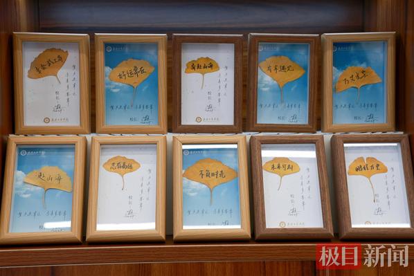 据悉,这份相框的创意源自该校标志性的银杏树,去年深秋,当金黄的银杏叶随风飘落时,学弟学妹们就开始了“秘密行动”,他们细心收集落叶,经过挑选、烘干、保存等工序,将一片片银杏叶珍藏至今。今年毕业季,这些承载着时光印记的叶子被取出,由学弟学妹、毕业班辅导员和学院党总支书记亲手在每一片银杏叶上写下毕业祝福,并张贴定格在相框背景卡上。相框背卡上印有该校校长孔建益教授题写的“努力更幸运 未来多喜幸”寄语和签名。这份毕业礼物的相框和背卡有两种颜色,每一片银杏叶的形状、大小、颜色都不相同,手写祝福的内容和字体风格也各异,使得每一份毕业礼物都成为独一无二的青春纪念品。