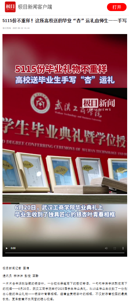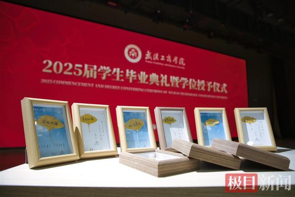 一片片去年深秋珍藏的银杏叶,一份校长亲笔写下的殷切寄语,一句句学弟学妹熬夜写下的祝福……6月20日,武汉工商学院举行2025届学生毕业典礼,5115名毕业生收到了一份别出心裁的毕业礼物——银杏叶青春相框,装着金黄银杏叶的相框,不仅封存着校园的最美秋色,更承载着师长同窗的暖心祝福。