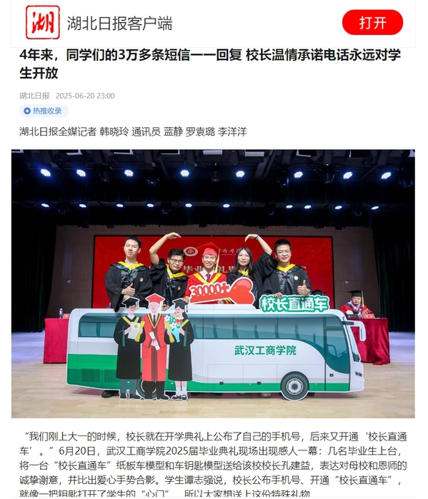 “我们刚上大一的时候,校长就在开学典礼上公布了自己的手机号,后来又开通‘校长直通车’。”6月20日,武汉工商学院2025届毕业典礼现场出现感人一幕:几名毕业生上台,将一台“校长直通车”纸板车模型和车钥匙模型送给该校校长孔建益,表达对母校和恩师的诚挚谢意,并比出爱心手势合影。学生谭志强说,校长公布手机号、开通“校长直通车”,就像一把钥匙打开了学生的“心门”,所以大家想送上这份特殊礼物。