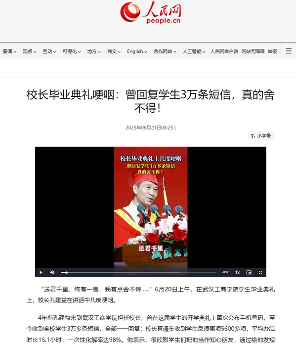 人民网:校长毕业典礼哽咽:曾回复学生3万条短信,真的舍不得!
