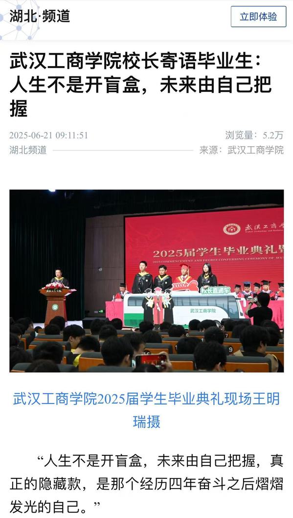 6月20日上午,武汉工商学院举行2025届学生毕业典礼暨学位授予仪式,校长孔建益用亲切又接地气的一番话为即将开启人生新征程的毕业生们加油打气。