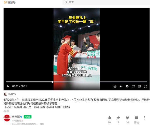 6月20日上午,在武汉工商学院2025届学生毕业典礼上,4位毕业生将名为“校长直通车”的车模型送给校长孔建益,用这份特殊的礼物表达他们对母校和恩师的诚挚谢意。 (记者:杨佳峰 通讯员:彭宠 蓝静 李洋洋 制作:白璐)