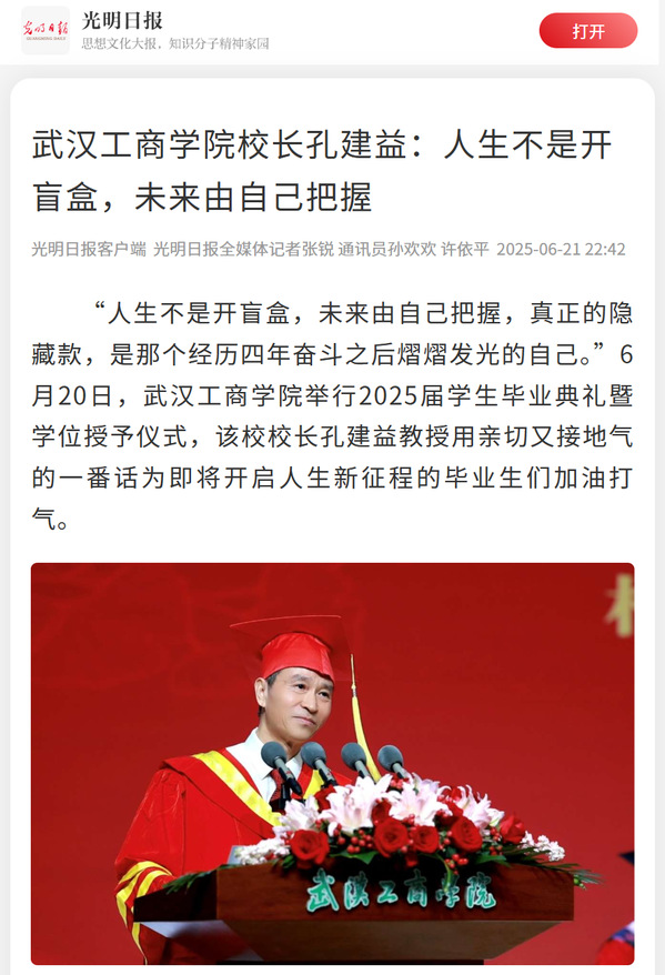 “人生不是开盲盒,未来由自己把握,真正的隐藏款,是那个经历四年奋斗之后熠熠发光的自己。”6月20日,武汉工商学院举行2025届学生毕业典礼暨学位授予仪式,该校校长孔建益教授用亲切又接地气的一番话为即将开启人生新征程的毕业生们加油打气。