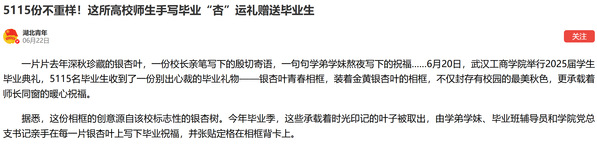 一片片去年深秋珍藏的银杏叶,一份校长亲笔写下的殷切寄语,一句句学弟学妹熬夜写下的祝福……6月20日,武汉工商学院举行2025届学生毕业典礼,5115名毕业生收到了一份别出心裁的毕业礼物——银杏叶青春相框,装着金黄银杏叶的相框,不仅封存有校园的最美秋色,更承载着师长同窗的暖心祝福。