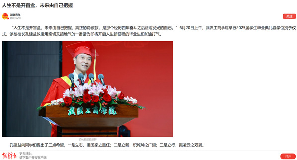 “人生不是开盲盒,未来由自己把握,真正的隐藏款,是那个经历四年奋斗之后熠熠发光的自己。”6月20日上午,武汉工商学院举行2025届学生毕业典礼暨学位授予仪式,该校校长孔建益教授用亲切又接地气的一番话为即将开启人生新征程的毕业生们加油打气。