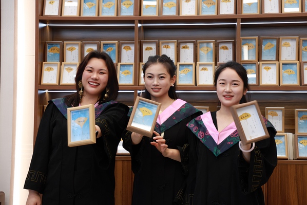 毕业典礼上,该校副校长刘生元亲自将这份特别的礼物送到优秀毕业生代表手中,各二级学院也在各自的学位授予仪式上送出这份礼物。不少毕业生表示,每一片叶子都承载着独特的祝福,收到相框的瞬间就像拆盲盒一样充满期待,而收获的感动更是远超预期。