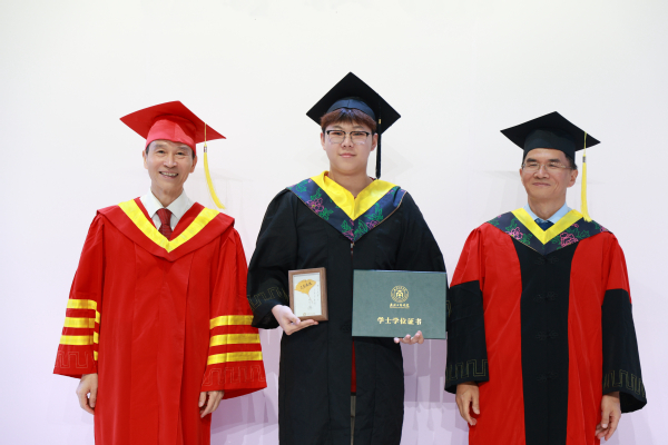 校长孔建益、计算机与自动化学院院长何顶新为毕业生赠送银杏叶青春相框并合影。芮雨欣摄