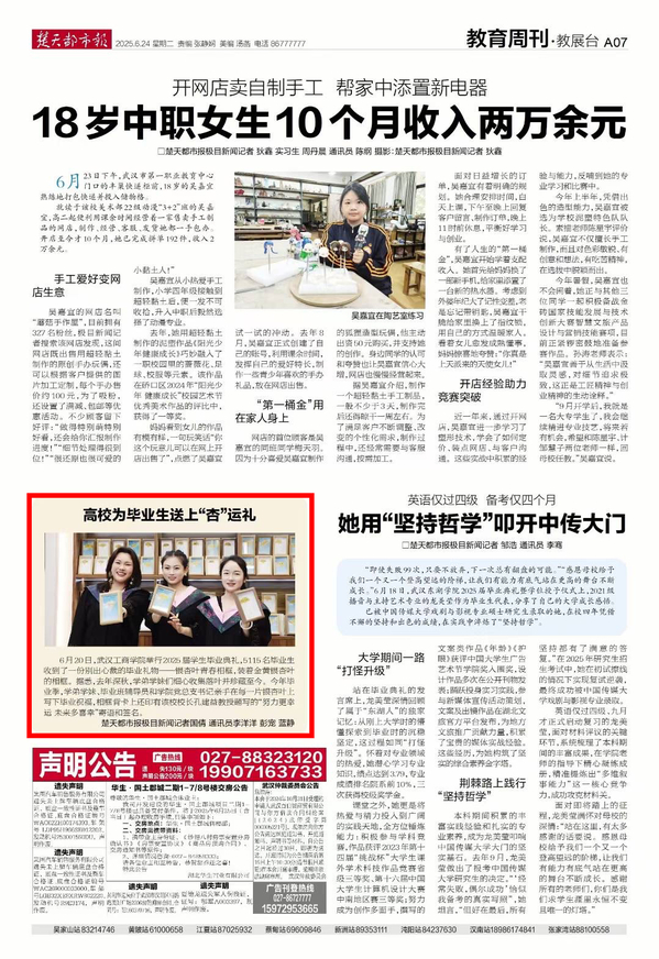 6月20日,武汉工商学院举行2025届学生毕业典礼,5115名毕业生收到了一份别出心裁的毕业礼物银杏叶青春相框,装着金黄银杏叶的相框。据悉,去年深秋,学弟学妹们细心收集落叶并珍藏至今。今年毕业季,学弟学妹、毕业班辅导员和学院党总支书记亲手在每一片银杏叶上写下毕业祝福,相框背卡上还印有该校校长孔建益教授题写的“努力更幸运 未来多喜幸寄语和签名。