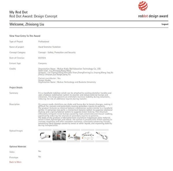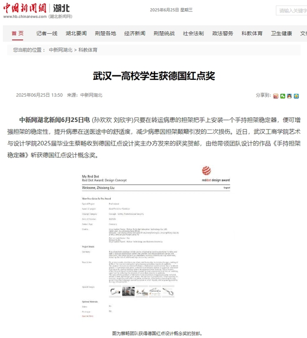 中新网湖北新闻6月25日电 (孙欢欢 刘欣宇)只要在转运病患的担架把手上安装一个手持担架稳定器,便可增强担架的稳定性,提升病患在送医途中的舒适度,减少病患因担架颠簸引发的二次损伤。近日,武汉工商学院艺术与设计学院2025届毕业生蔡畅收到德国红点设计奖主办方发来的获奖贺邮,由他带领团队设计的作品《手持担架稳定器》斩获德国红点设计概念奖。