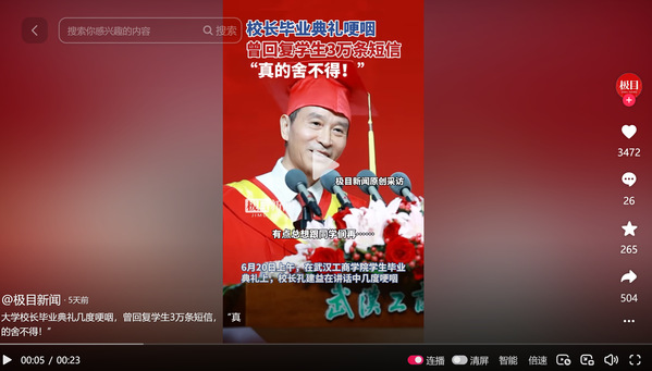 极目新闻抖音:大学校长毕业典礼几度哽咽,曾回复学生3万条短信,“真的舍不得!”