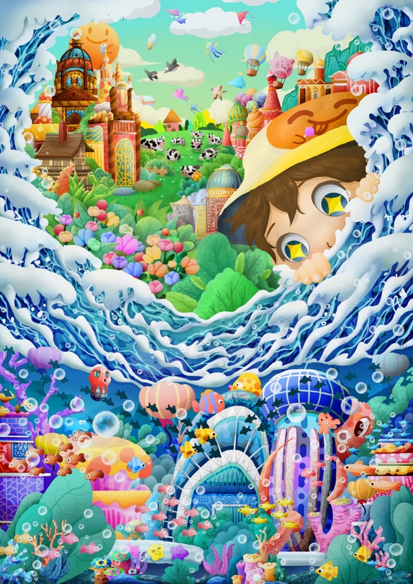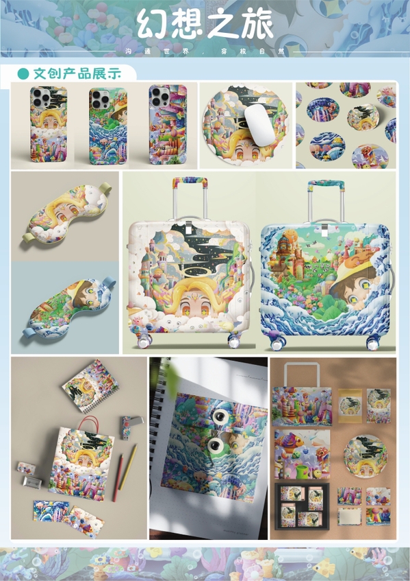 全国一等奖作品《幻想之旅》的主要负责人孙薛宝介绍,该作品融入了对自然的崇拜,呼应人类亲近、探索自然,以“对抗电子茧房”为切入点,通过奇幻插画场景传达亲近自然的理念,特别关注当今科技环境下儿童的成长需求,呼吁引导儿童探索自然。作品不仅完成系列插画设计,还延伸至实用场景及相关文创产品开发。