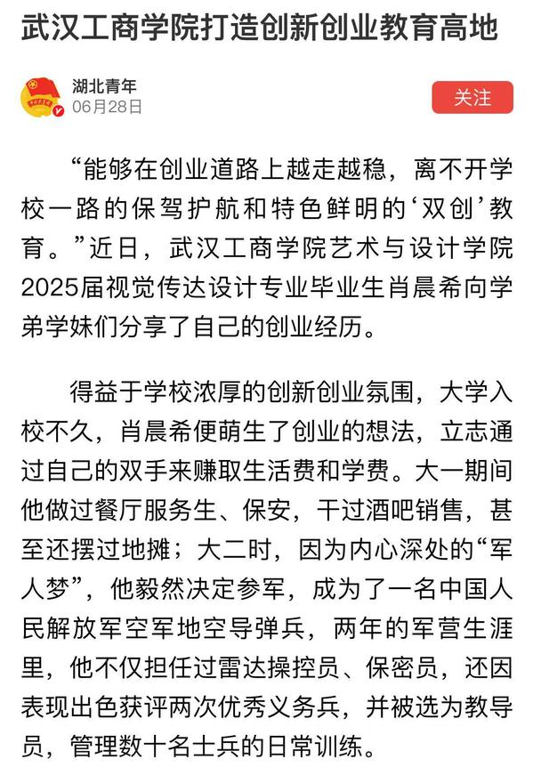 “能够在创业道路上越走越稳,离不开学校一路的保驾护航和特色鲜明的‘双创’教育。”近日,武汉工商学院艺术与设计学院2025届视觉传达设计专业毕业生肖晨希向学弟学妹们分享了自己的创业经历。