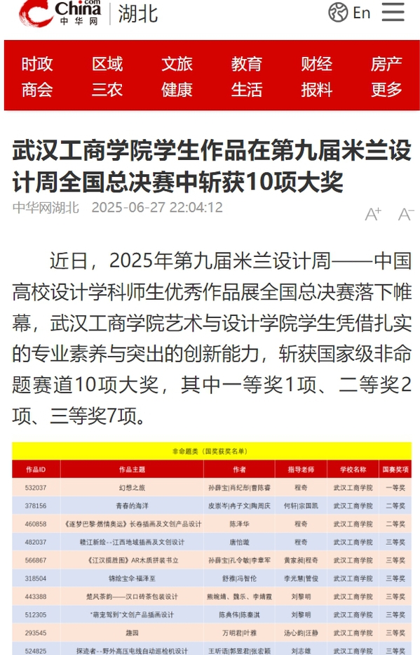 近日,2025年第九届米兰设计周——中国高校设计学科师生优秀作品展全国总决赛落下帷幕,武汉工商学院艺术与设计学院学生凭借扎实的专业素养与突出的创新能力,斩获国家级非命题赛道10项大奖,其中一等奖1项、二等奖2项、三等奖7项。