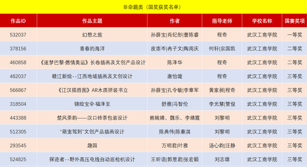 在本次大赛中,学生孙薛宝、肖纪彤、曹陈睿的作品《幻想之旅》(指导老师:程奇)在非命题赛道中斩获全国一等奖;学生皮崇岑、冉子文、陶周庆的作品《青春的海洋》(指导老师:何轩、宗国凯),学生陈泽华的作品《〈逐梦巴黎燃情奥运〉长卷插画及文创产品设计》(指导老师:程奇)荣获全国二等奖;另有7件作品荣获全国三等奖。