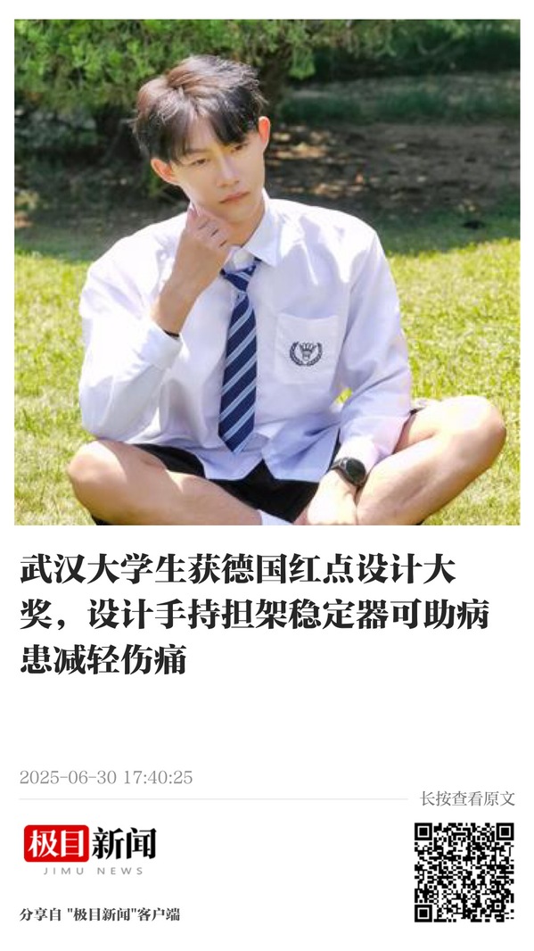 只要在转运病患的担架把手上安装一个手持担架稳定器,便可增强担架的稳定性,提升病患在送医途中的舒适度,减少病患因担架颠簸引发的二次损伤。近日,武汉工商学院艺术与设计学院2025届毕业生蔡畅收到德国红点设计奖主办方发来的获奖贺邮,由他带领团队设计的作品《手持担架稳定器》斩获德国红点设计概念奖。