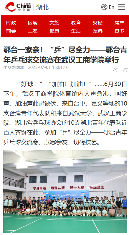 “好球!”“加油!加油!”……6月30日下午,武汉工商学院体育馆内人声鼎沸,叫好声、加油声此起彼伏,来自台中、嘉义等地的10支台湾青年代表队和来自武汉大学、武汉工商学院、湖北省乒乓球协会的10支湖北青年代表队近百人齐聚在此,参加“乒”尽全力——鄂台青年乒乓球交流赛,以赛会友、切磋技艺。