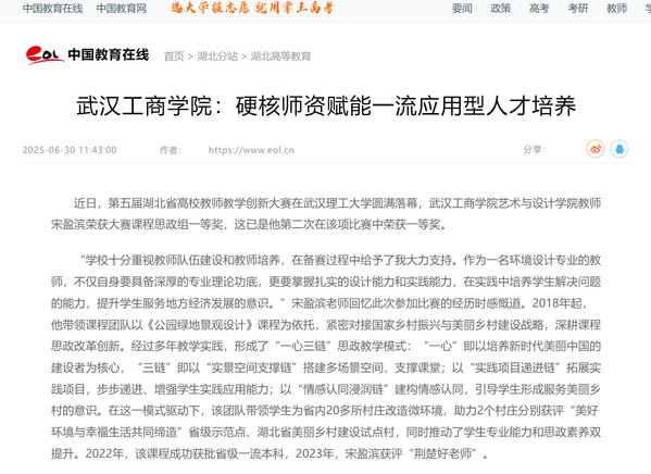 “学校十分重视教师队伍建设和教师培养,在备赛过程中给予了我大力支持。作为一名环境设计专业的教师,不仅自身要具备深厚的专业理论功底,更要掌握扎实的设计能力和实践能力,在实践中培养学生解决问题的能力,提升学生服务地方经济发展的意识。”宋盈滨老师回忆此次参加比赛的经历时感慨道。2018年起,他带领课程团队以《公园绿地景观设计》课程为依托,紧密对接国家乡村振兴与美丽乡村建设战略,深耕课程思政改革创新。经过多年教学实践,形成了“一心三链”思政教学模式:“一心”即以培养新时代美丽中国的建设者为核心,“三链”即以“实景空间支撑链”搭建多场景空间,支撑课堂;以“实践项目递进链”拓展实践项目,步步递进、增强学生实践应用能力;以“情感认同浸润链”建构情感认同,引导学生形成服务美丽乡村的意识。在这一模式驱动下,该团队带领学生为省内20多所村庄改造微环境,助力2个村庄分别获评“美好环境与幸福生活共同缔造”省级示范点、湖北省美丽乡村建设试点村,同时推动了学生专业能力和思政素养双提升。2022年,该课程成功获批省级一流本科,2023年,宋盈滨获评“荆楚好老师”。