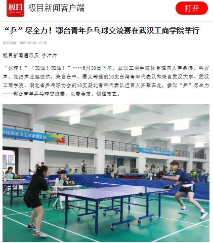 “好球!”“加油!加油!”……6月30日下午,武汉工商学院体育馆内人声鼎沸,叫好声、加油声此起彼伏,来自台中、嘉义等地的10支台湾青年代表队和来自武汉大学、武汉工商学院、湖北省乒乓球协会的10支湖北青年代表队近百人齐聚在此,参加“乒”尽全力——鄂台青年乒乓球交流赛,以赛会友、切磋技艺。