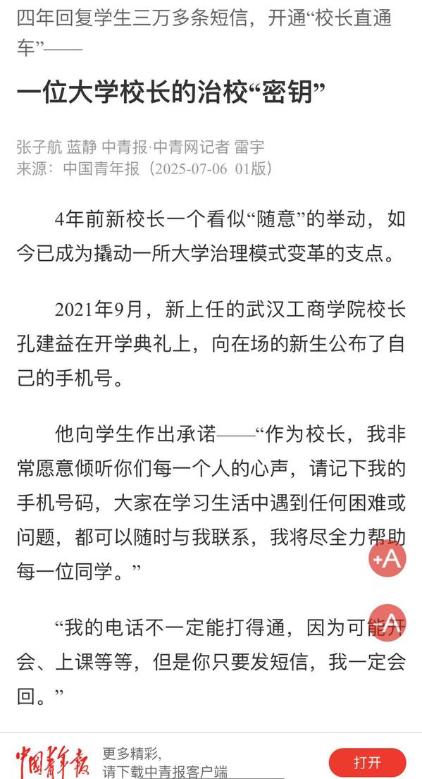 2021年9月,新上任的武汉工商学院校长孔建益在开学典礼上,向在场的新生公布了自己的手机号。