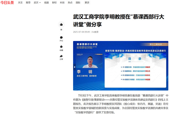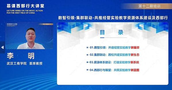 7月3日下午,武汉工商学院首席教授李明受邀在教育部“慕课西部行大讲堂”中作题为《数智引领·集群联动——共推经管实验教学资源体系建设及西部行》的线上主题报告,此次报告展示了李明教授及其团队(核心成员:张丹丹、黄颖、吴迪)在经管类实验教学领域的创新探索与实践成果,为全国经管类实验教学资源的共建共享及“实验教学西部行”提供了宝贵经验。