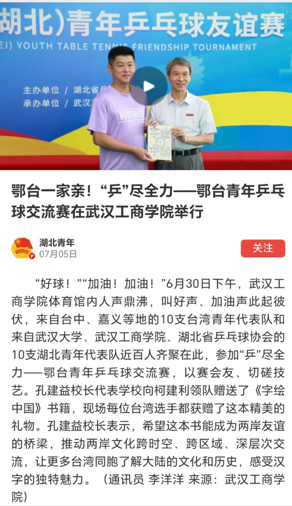 “好球!”“加油!加油!”6月30日下午,武汉工商学院体育馆内人声鼎沸,叫好声、加油声此起彼伏,来自台中、嘉义等地的10支台湾青年代表队和来自武汉大学、武汉工商学院、湖北省乒乓球协会的10支湖北青年代表队近百人齐聚在此,参加“乒”尽全力——鄂台青年乒乓球交流赛,以赛会友、切磋技艺。孔建益校长代表学校向柯建利领队赠送了《字绘中国》书籍,现场每位台湾选手都获赠了这本精美的礼物。孔建益校长表示,希望这本书能成为两岸友谊的桥梁,推动两岸文化跨时空、跨区域、深层次交流,让更多台湾同胞了解大陆的文化和历史,感受汉字的独特魅力。(通讯员 李洋洋)