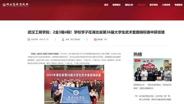 赛场上,武汉工商学院参赛学生们以刚劲有力的动作、流畅自然的套路展示了他们日复一日的训练成果和积极向上的精神风貌,一招一式中尽显中华武术的博大精深。“站上领奖台的那一刻,我觉得所有的汗水和付出都得到了回报,这是2024年收到得最好的礼物了!”来自学校管理学院2022级会计专业的学生杨佳妮获得了甲组(本科)武术套路项目金奖之后开心地说。她还表示今后会不断加强训练,在武术这条道路上继续前行,争取参加更多高规格的比赛,和更优秀的选手进行切磋交流,为校争光。