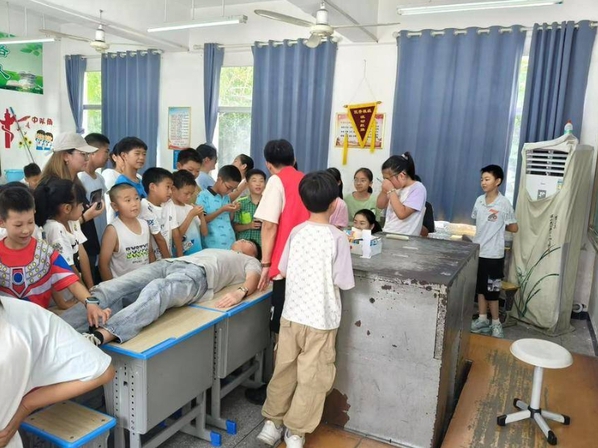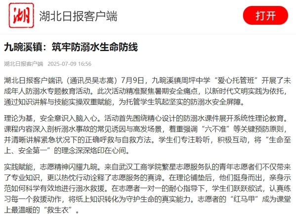 实践赋能,志愿精神闪耀九畹。来自武汉工商学院繁星志愿服务队的青年志愿者们不仅带来了专业知识,更以热忱行动诠释了志愿服务的真谛。在理论铺垫后,他们挺身而出,亲身示范如何科学有效地进行溺水救援。在志愿者一对一的耐心指导下,学生们跃跃欲试,认真练习每一个救援动作,将纸上知识转化为守护生命的真实能力。志愿者的“红马甲”成为课堂上最温暖的“救生衣”。