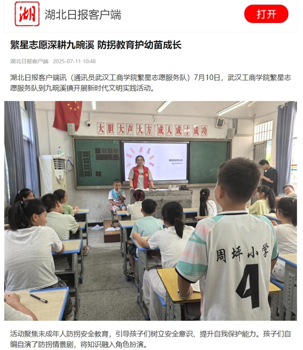 湖北日报客户端讯(通讯员 武汉工商学院繁星志愿服务队)7月10日,武汉工商学院繁星志愿服务队到九畹溪镇开展新时代文明实践活动。