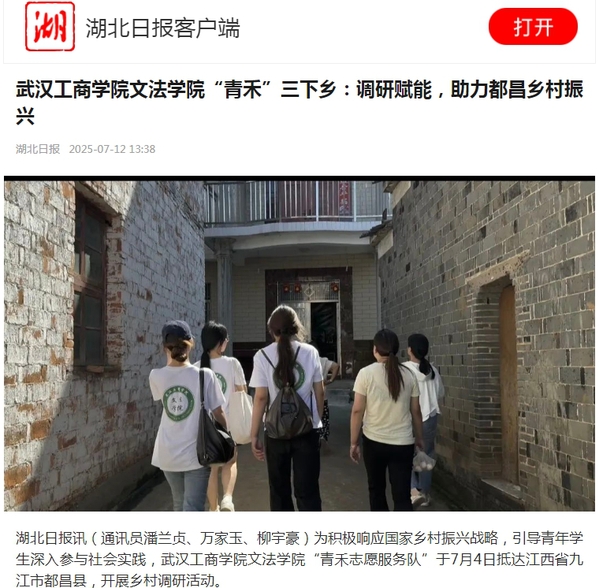 湖北日报讯(通讯员潘兰贞、万家玉、柳宇豪)为积极响应国家乡村振兴战略,引导青年学生深入参与社会实践,武汉工商学院文法学院“青禾志愿服务队”于7月4日抵达江西省九江市都昌县,开展乡村调研活动。