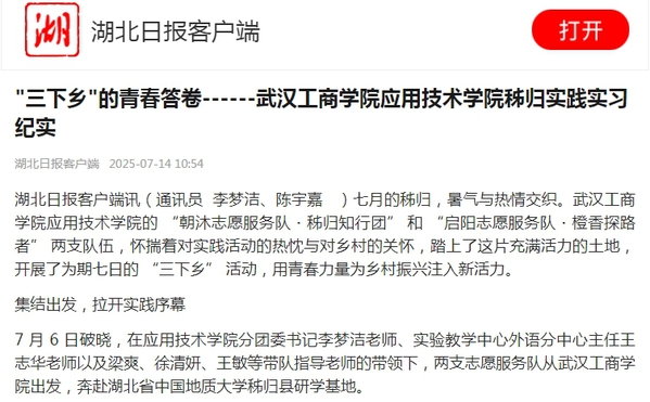 湖北日报客户端讯(通讯员 李梦洁、陈宇嘉)七月的秭归,暑气与热情交织。武汉工商学院应用技术学院的 “朝沐志愿服务队・秭归知行团” 和 “启阳志愿服务队・橙香探路者” 两支队伍,怀揣着对实践活动的热忱与对乡村的关怀,踏上了这片充满活力的土地,开展了为期七日的 “三下乡” 活动,用青春力量为乡村振兴注入新活力。