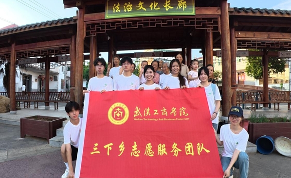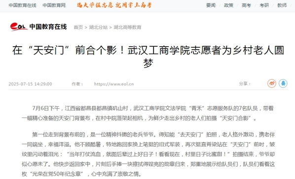 7月6日下午,江西省都昌县都昌镇矶山村,武汉工商学院文法学院“青禾”志愿服务队的7名队员,带着一幅精心准备的天安门背景布,在村中院落架起相机,为鲜少走出乡村的老人们拍摄“天安门合影”。