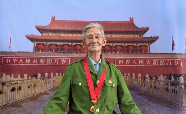 第一位走到背景布前的,是一位精神抖擞的老兵爷爷。得知能“去天安门”拍照,老人格外激动,携老伴一同端坐,幸福洋溢。他不顾酷暑,特地跑回家换上笔挺的旧式军装,再次挺直脊梁站在“天安门”前时,皱纹里闪动着泪光:“当年打仗流血,就图后辈过上好日子!看看现在,村里日子比蜜甜!”拍摄结束,爷爷却似心愿未了。他快步返回家中,片刻后手捧一块擦拭得锃亮的勋章归来,郑重地展示给队员们,队员们看着这枚“光荣在党50年纪念章”,心中充满了崇敬之情。