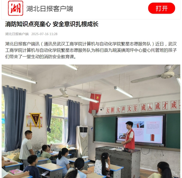 湖北日报客户端讯(通讯员 武汉工商学院计算机与自动化学院繁星志愿服务队)近日,武汉工商学院计算机与自动化学院繁星志愿服务队为秭归县九畹溪镇周坪中心爱心托管班的孩子们带来了一堂生动的消防安全教育课。