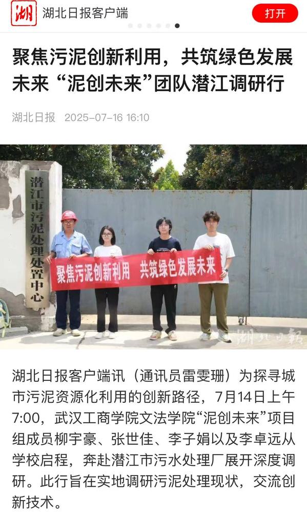 湖北日报客户端讯(通讯员 雷雯珊)为探寻城市污泥资源化利用的创新路径,7月14日上午7:00,武汉工商学院文法学院“泥创未来”项目组成员柳宇豪、张世佳、李子娟以及李卓远从学校启程,奔赴潜江市污水处理厂展开深度调研。此行旨在实地调研污泥处理现状,交流创新技术。