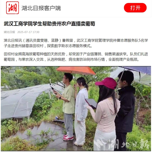 湖北日报讯(通讯员雷雯珊、蓝静)暑假里,武汉工商学院管理学院仲夏志愿服务队5名学子走进贵州赫章县田坝村,探索数字助农志愿服务模式。