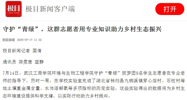 未来,团队将持续跟踪秭归生态治理与产业发展,深化校地合作,助力乡村振兴。带队老师尹佳丽表示:“守护青绿,步履不停。我们将努力让‘三下乡’的青春足迹,化作连接高校智慧与基层需求的坚实桥梁,在荆楚大地上绘就更绚丽的生态振兴画卷。”