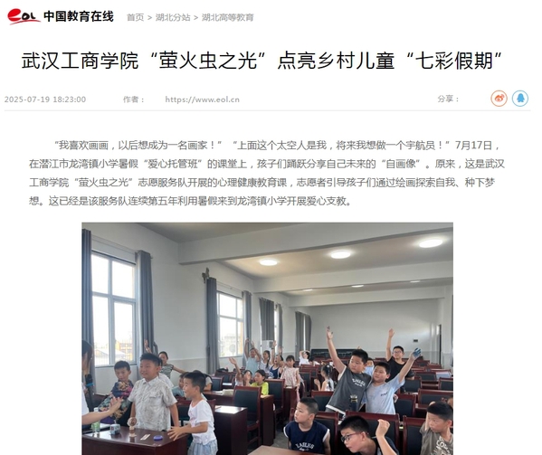 “我喜欢画画,以后想成为一名画家!”“上面这个太空人是我,将来我想做一个宇航员!”7月17日,在潜江市龙湾镇小学暑假“爱心托管班”的课堂上,孩子们踊跃分享自己未来的“自画像”。原来,这是武汉工商学院“萤火虫之光”志愿服务队开展的心理健康教育课,志愿者引导孩子们通过绘画探索自我、种下梦想。这已经是该服务队连续第五年利用暑假来到龙湾镇小学开展爱心支教。