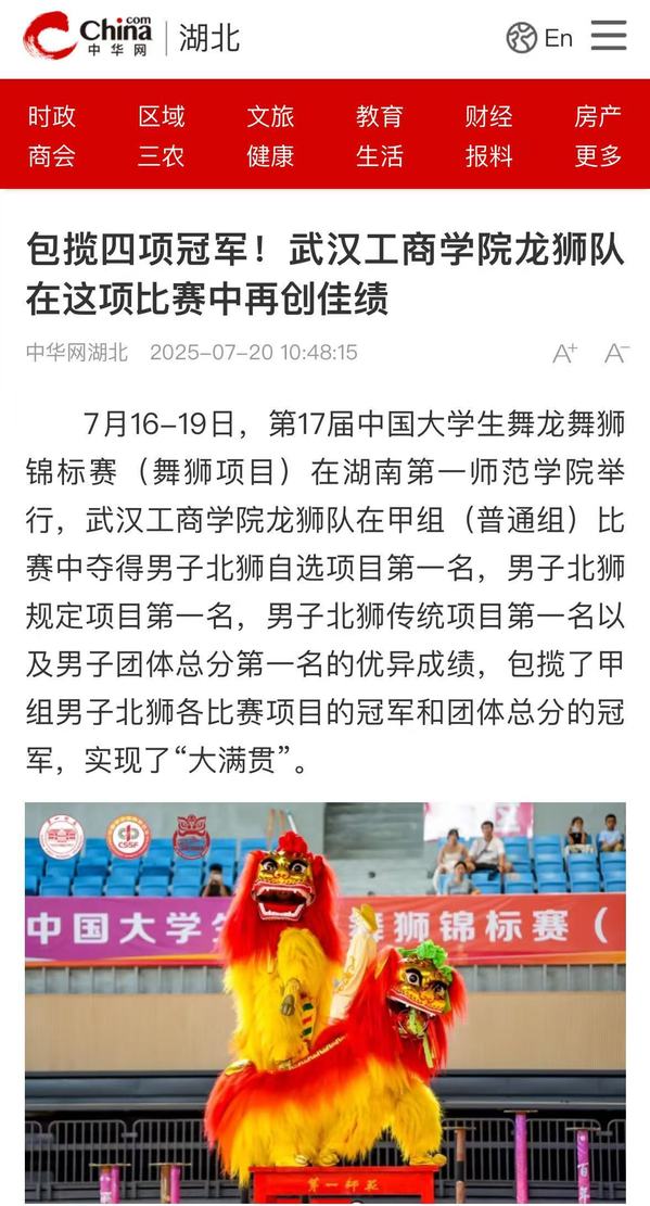 据悉,此次比赛由中国学生体育联合会主办,分男子组、女子组,设有南狮自选套路、北狮自选套路等多个比赛项目。武汉工商学院龙狮队的精彩表现,充分展现了武工商学子团结协作、奋勇拼搏的青春风采,也彰显了该校坚持“五育并举”取得的丰硕成果。该校公共课部主任吴珊表示,将以本次比赛为契机,以赛促学,以赛促训,认真总结参赛经验,持续提升队员竞技水平,不断向更高层次、更高水准的国际和国内赛事发起冲击,力求在重大体育赛事中取得更优异的成绩。(通讯员:蓝静)