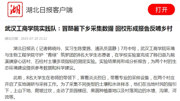 湖北日报讯(记者韩晓玲、实习生陈雯茜、通讯员蓝静)7月中旬,武汉工商学院环境与生物工程学院守护“青绿”筑梦团的8名大学生志愿者,在学校实验室完成了秭归县九畹溪镇穿心店村、石柱村土壤多项指标的测定实验。实验结果将形成分析报告,为两个村的生态环境建设提供参考数据和科学建议。