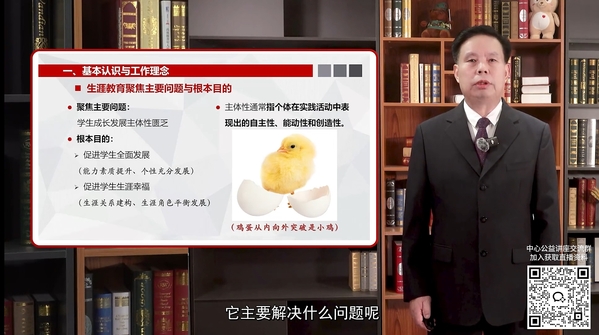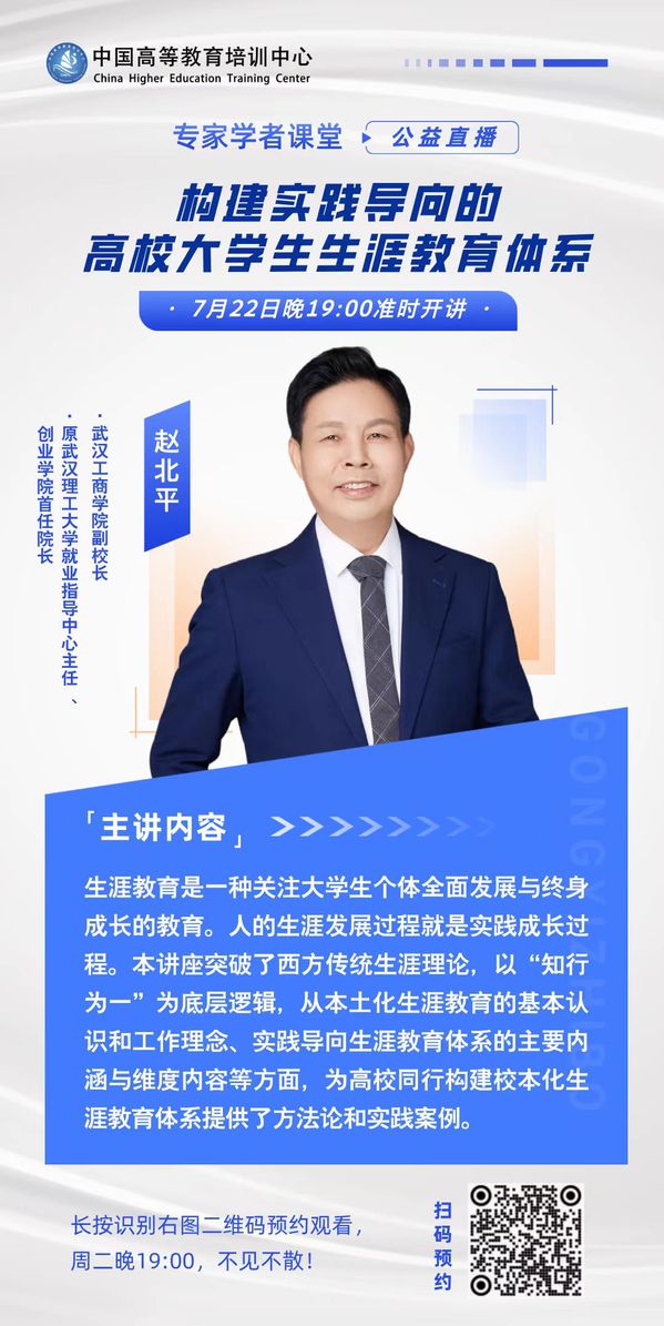 新闻中心讯(记者 孙欢欢)“生涯教育是一种关注大学生个体全面发展与终身成长的教育。人的生涯发展过程就是认知不断迭代、实践成长的过程。”7月22日19:00,教育部普通高校就业创业指导委员会委员、湖北省生涯教育研究会副会长、武汉工商学院副校长赵北平应邀做客中国高等教育培训中心主办的“专家学者课堂”,作了题为《构建实践导向的高校大学生生涯教育体系》的报告,吸引了全国高校数千人次在线同步学习观看。