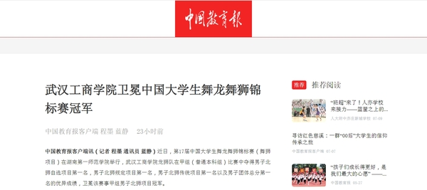 中国教育报客户端讯(记者 程墨 通讯员 蓝静)近日,第17届中国大学生舞龙舞狮锦标赛(舞狮项目)在湖南第一师范学院举行,武汉工商学院龙狮队在甲组(普通本科组)比赛中夺得男子北狮自选项目第一名,男子北狮规定项目第一名,男子北狮传统项目第一名以及男子团体总分第一名的优异成绩,卫冕该赛事甲组男子北狮项目冠军。