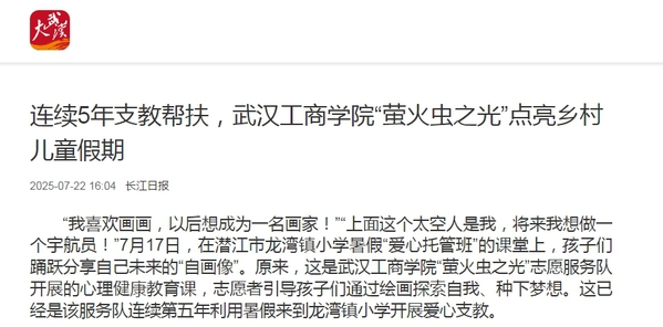 今年6月,该校“萤火虫之光”志愿服务队入选湖北省2025年“圆梦工程”助力乡村学校少年宫“七彩假期”志愿服务项目和湖北省2025年“爱心托管班”七彩假期志愿服务项目,结对志愿帮扶潜江市龙湾镇小学。