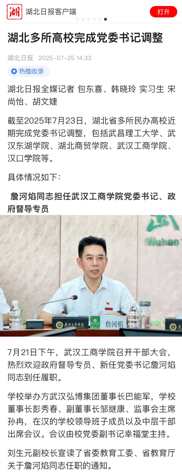 截至2025年7月23日,湖北省多所民办高校近期完成党委书记调整,包括武昌理工大学、武汉东湖学院、湖北商贸学院、武汉工商学院、汉口学院等。